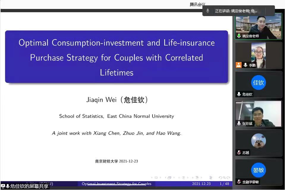 12月23日下午,应大乐透 邀请,华东师范大学经管学部博士生导师危佳钦教授作了题为“Optimal Consumption-investment and Life-insurance Purchase Strategy for Couples with Correlated Lifetimes”的学术讲座。讲座由副院长姚定俊主持,大乐透 部分教师和研究生聆听了本次讲座。