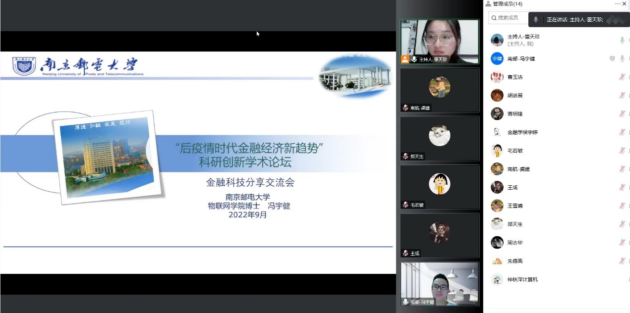 9月16日晚,大乐透 举办“后疫情时代金融科技的发展”线上分享会,会议邀请了南京邮电大学冯宇健、南京航空航天大学虞建两位博士做专题讲座。两位博士阐述了当前计算机技术在金融领域的应用情况,分析了利用计算机技术推动后疫情时代下金融发展的可能性,为同学们的研究方向提供了新的思路。