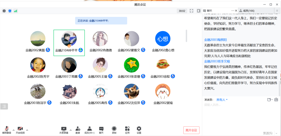 线上观看的同学们也积极参与互动讨论,大家纷纷表示要谨记革命精神,传承先驱意志。金融2001班的浦贾甜甜同学说:“一个有希望的民族不能没有英雄,一个有前途的国家不能没有先锋”;金融2002班的陆颖同学认为:“铭记历史、居安思危才是对历史的正确态度”;金融2003班的吴婉茹同学表示:“要肩负起青年人的历史责任和使命。”
