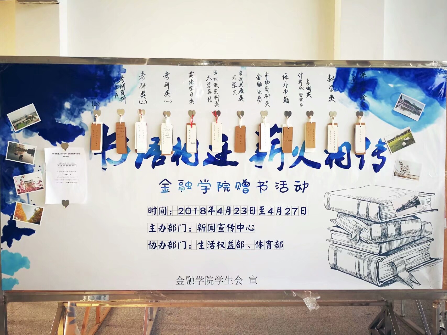 4月23至24日,大乐透 学生会成员走访各个宿管站,将收集到的书籍分门别类,再根据书名制作书签,并在背面标上序号,以便参与抽奖。