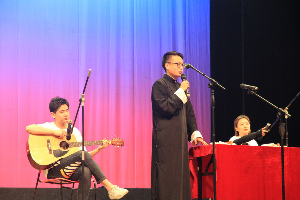石悦、冯若晨两枚大将又上场了——《拴娃娃》,社长石悦可是被这段相声“整”的不轻,“金毛狮王”爸爸的故事贯穿始终,精彩连连!最后,前社长周有颜、潘老师带来压轴节目——经典的《黄鹤楼》,逗的在座观众困意全无,台上演绎经典,台下也是欢呼连连!
