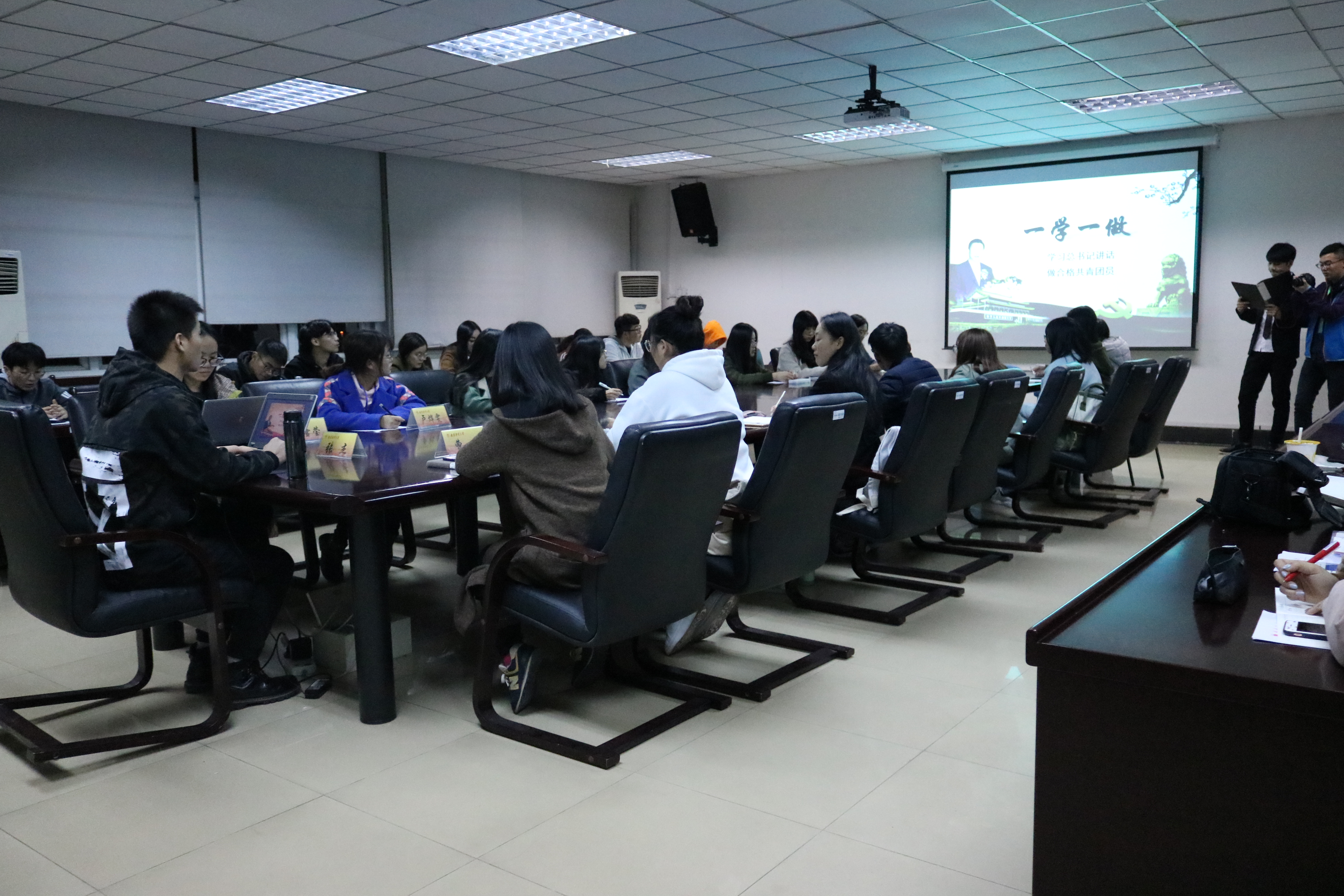 11月20日晚18:30,青马班第一次主题团课在德经楼508会议室开课。本次我们请到了国际经贸学院国贸1503班的张杰学长,为青马班学员们解读习近平总书记“一学一做”讲话精神和明确做合格共青团员的标准。分团委助理孙智浩为本次团课的主持人。