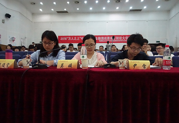 5月6日下午6:30,2016“万人之上”中国大学生金融挑战赛大乐透 校内赛在专二报告厅成功举行。本次挑战赛由中国金融博物馆、中国金融启蒙中心主办,大乐透 创业协会、大乐透 学生会承办,大乐透 金融系主任莫媛老师、副主任尹雷老师和孟俊宏老师担任此次比赛评委。