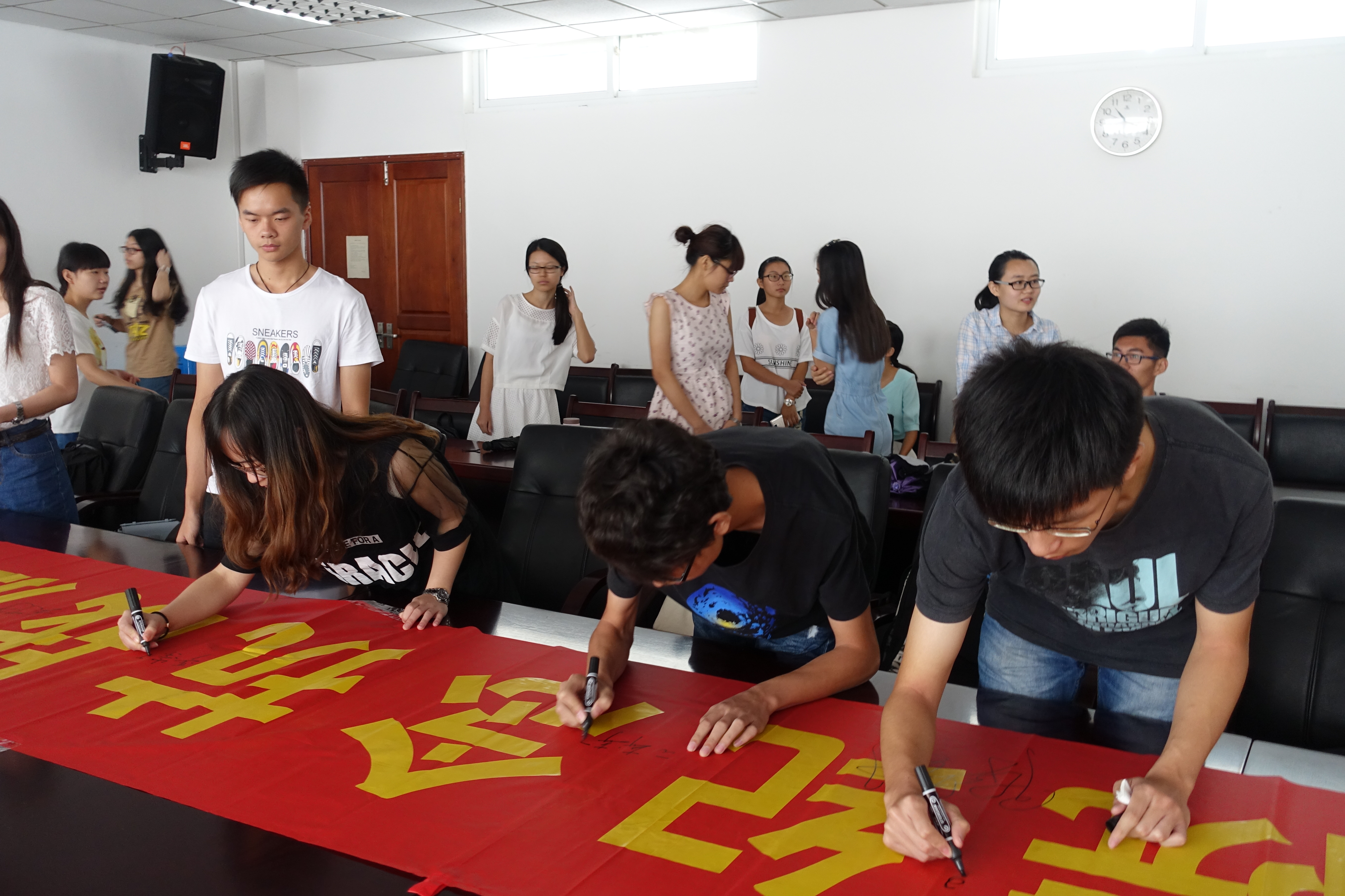 观看阅兵仪式后,全体成员在纪念抗战胜利70周年横幅上签名,这不仅是印迹的留存,更是爱国的宣言。