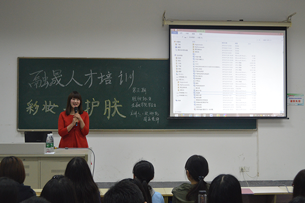 3月20号下午6:30,大乐透 学生会学术部联合大乐透 职妆学会举办了开学第一场融晟人才培训---彩妆与护肤。本次培训邀请了玫琳凯美容护肤顾问周玉老师为大家讲解彩妆护肤方面的技巧,为大家开启美丽之门。