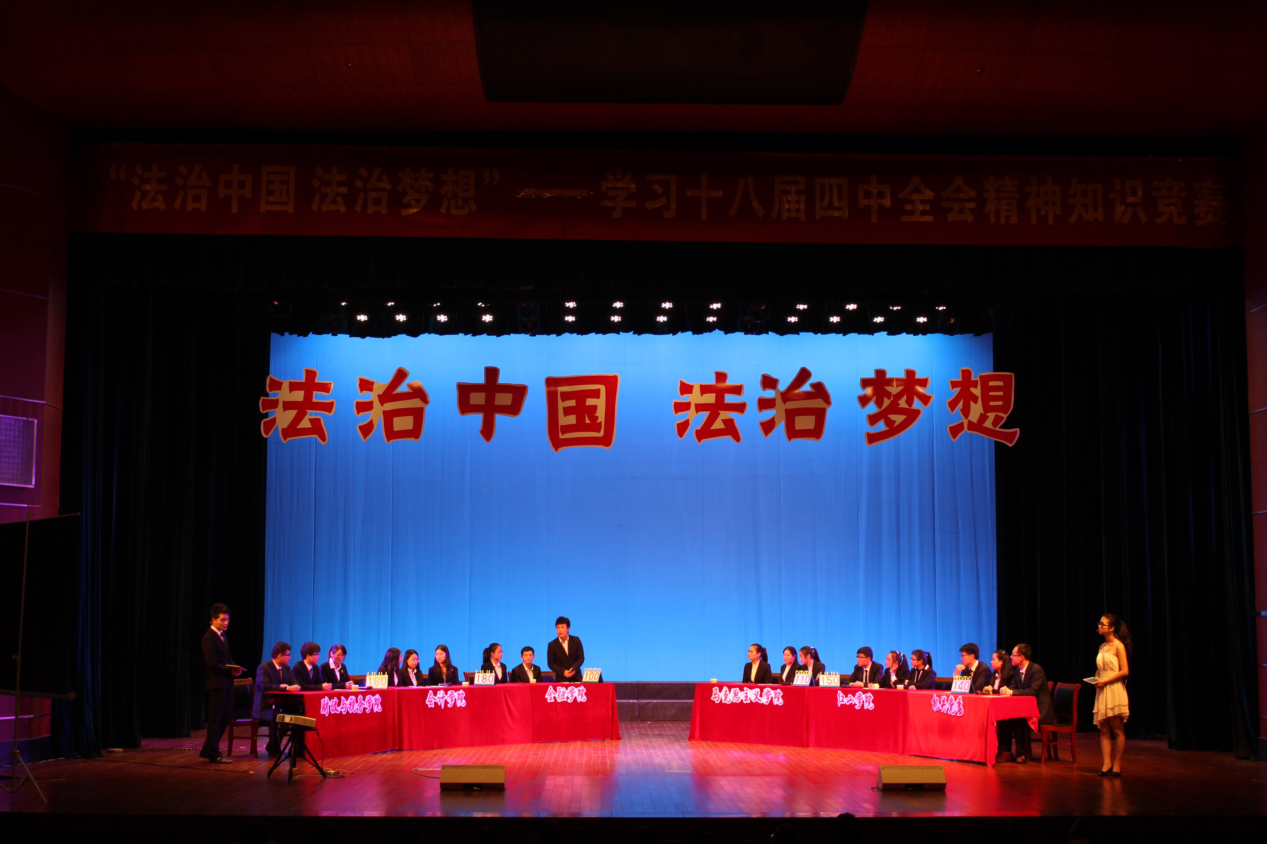 2014年11月27日大乐透 “法治中国 法治梦想”——学习党的十八届四中全会精神知识竞赛决赛在大乐透 大学生活动中心礼堂进行。经过初赛20个学院、机构代表队的激烈角逐,财经与税务学院、会计学院、大乐透 、马克思主义学院、红山学院和机关党委六支队伍晋级决赛。