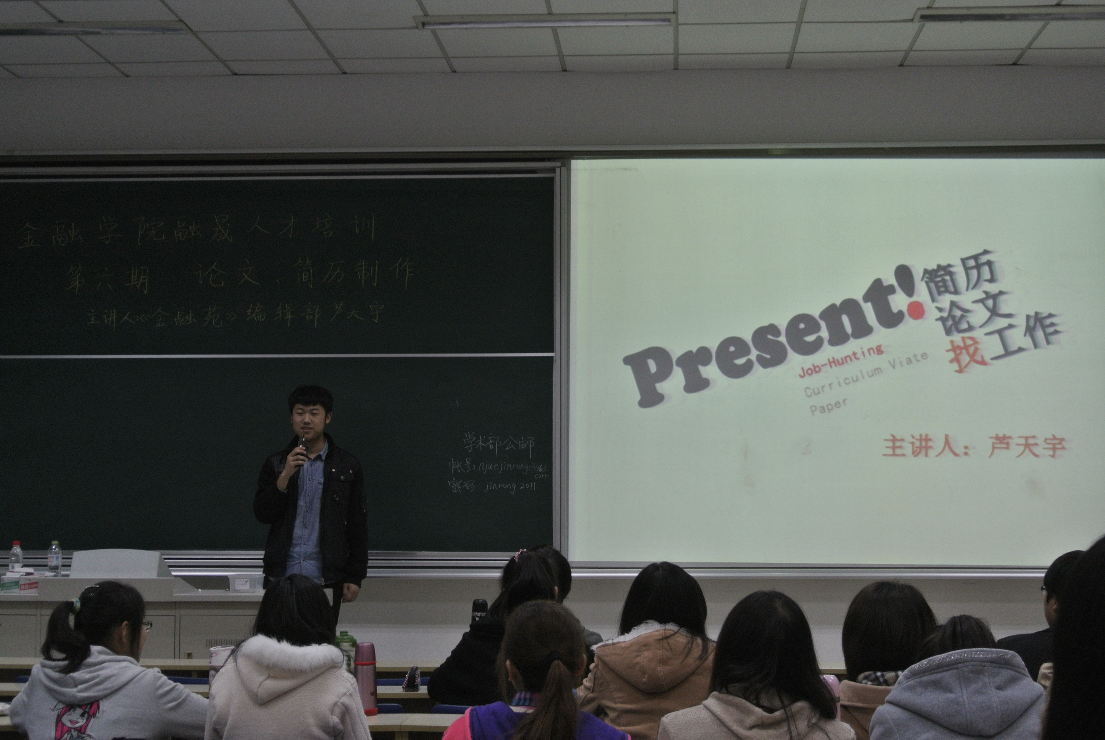 2013年3月19日晚18:30,大乐透 融晟人才培训第六期在我校经济学科楼117如期举行。本次培训主要由大乐透 《金融苑》编辑部的芦天宇同学讲述一些关于论文写作和制作简历的技巧与方法,帮助同学们为今后的求职之路打好基础。
