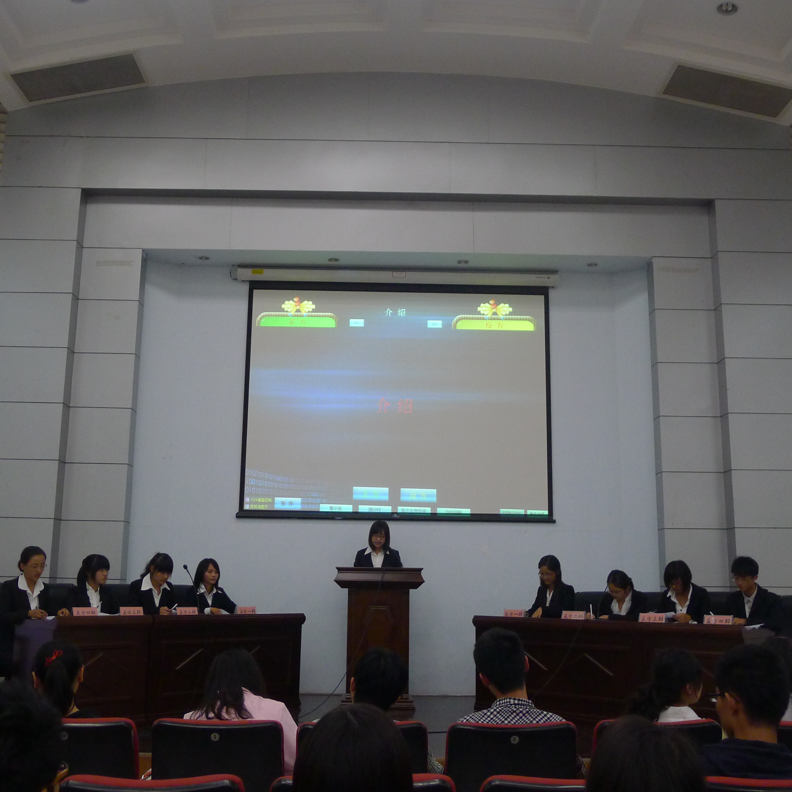 本次辩论赛在双方各自的自我介绍中正式开始。首先由双方一辩用高度概括性的陈述为各自辩队开篇立论。正方一辩以各种明文条例为证,向大家提出他们的观点;反方一辩条理清晰,用三个分论点阐述了己方观点。接着便是双方二辩的深度阐述及对辩,双方彼此反驳,她们灵活的思维和缜密的逻辑推理,不时博来阵阵掌声。然后,双方激烈的三辩盘问,让现场观众顿时感受到弥漫的硝烟。随后,短短四分钟的自由辩掀起了全场高潮,面对正方的引经据典,旁征博引,反方守住阵线,奋起反击,一次次化险为夷。经过激烈的言辞对抗后,双方四辩的总结陈词起到了画龙点睛的作用。