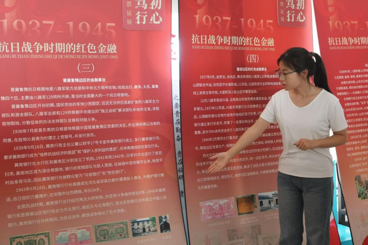 在展馆导览环节,讲解员李韵、高欣语以馆藏的珍贵票证为实证,系统梳理了中国共产党领导下的红色金融“四次跨越”,从成立初期,到土地革命时期,抗日战争时期,再到解放战争时期,一张张珍贵的票证实物,生动展现了中国共产党在不同历史阶段为打破经济封锁、稳定金融秩序所做出的艰苦努力与卓越贡献。讲解特别剖析了中华苏维埃时期票证,生动阐释了红色金融“服务革命战争、保障民生供给、促进经济建设”的三重使命,引导青年学子深刻理解“金融为民”的本质属性。