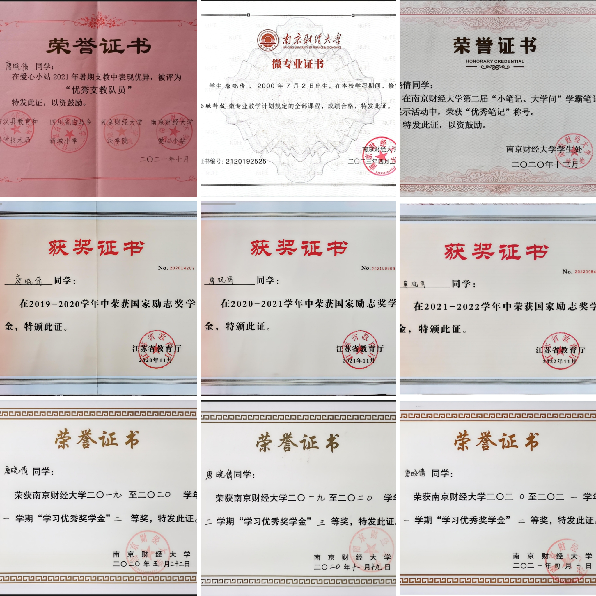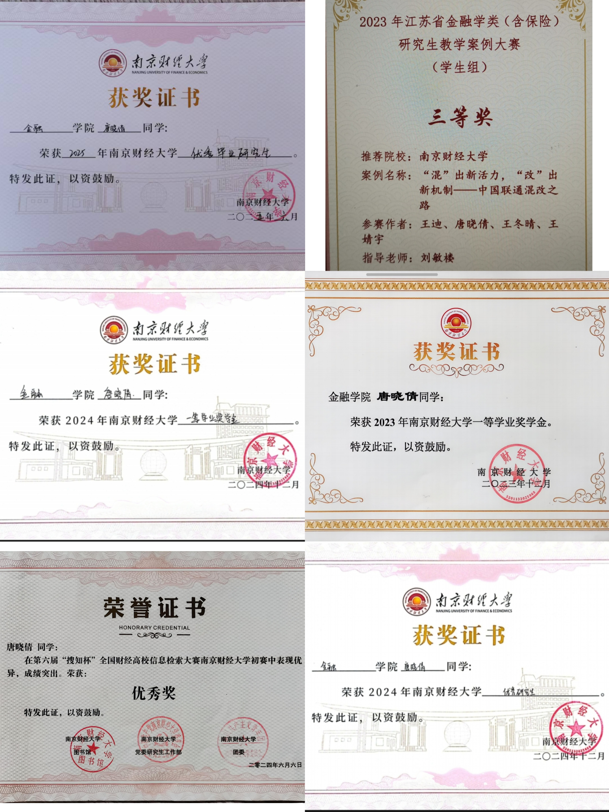 唐晓倩硕士研究生阶段所获荣誉证书