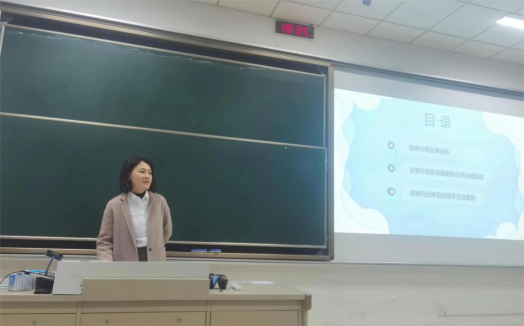陈秀丛专家首先从国内证券公司历年收入结构分析入手,向同学们介绍了证券公司的主要业务。随后引入《中华人民共和国反洗钱法》,并结合反洗钱及反恐融资法律法规及国务院规定、金融机构反洗钱及反恐融资相关规定,为同学们进行了证券行业反洗钱相关法律法规的梳理。她以安徽合肥汪氏家族洗钱案为主要案例,用通俗生动的语言介绍了证券行业常见的洗钱手法和可疑交易线索的发现途径。在讲解各类洗钱行为的危害及防范手段的同时,也极大丰富了同学们对反洗钱工作的认识。
