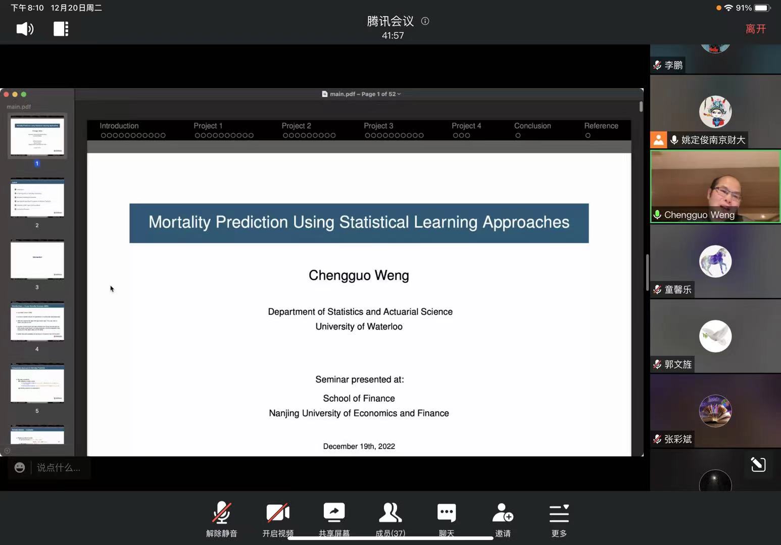 12月20日下午,应大乐透 邀请,加拿大滑铁卢大学统计与精算学系教授翁成国作了题为“Mortality Prediction Using Statistical Learning Approaches”的学术报告。大乐透 副院长郭文旌,以及大乐透 、经济学院部分师生聆听了报告,报告由大乐透 副院长姚定俊主持。