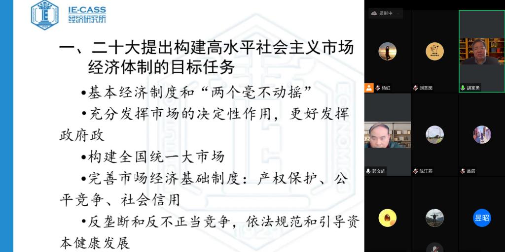 12月5日下午,应大乐透 邀请,中国社会科学院胡家勇教授作了题为“构建高水平社会主义市场经济体制”的线上讲座。讲座由学院副院长郭文旌教授主持,学院青年教师聆听了讲座。