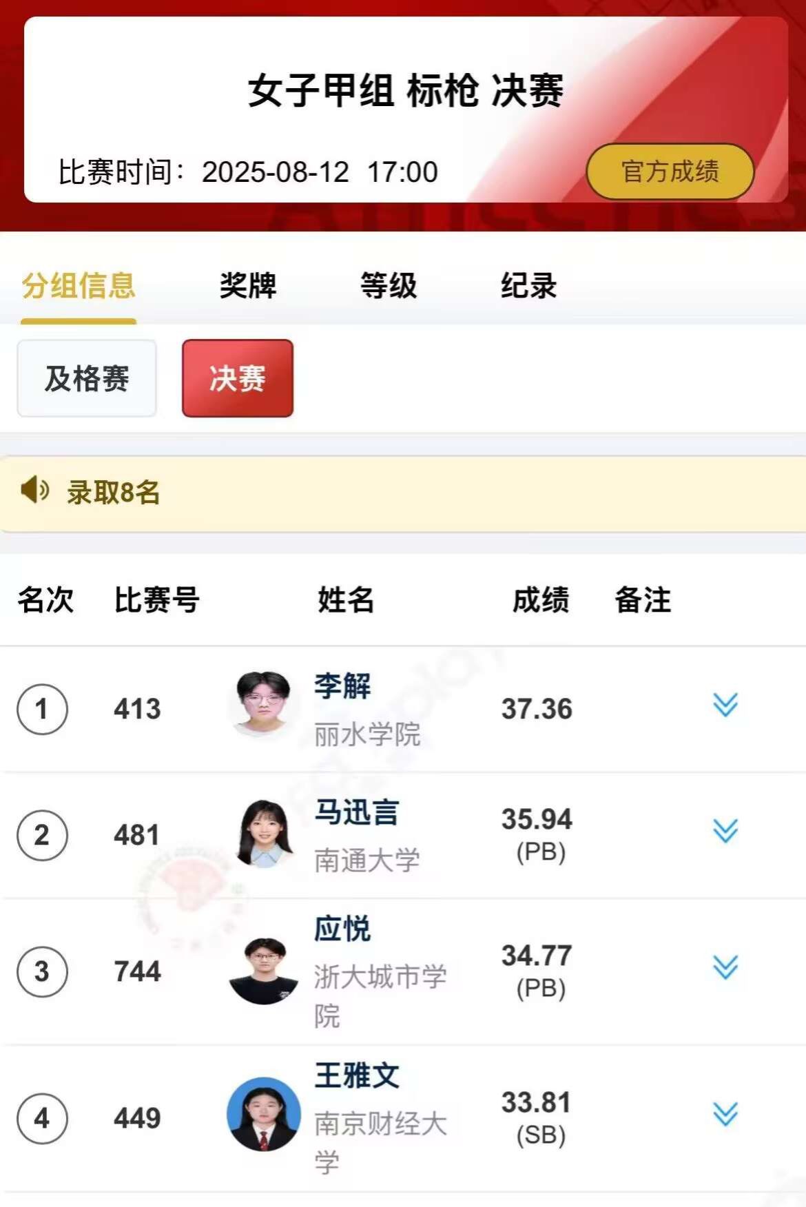 8月9日,由中国大学生体育协会、中国田径协会举办的第23届中国大学生田径锦标赛在黄石奥体中心拉开帷幕。8月12日,我校金融2301班王雅文同学在女子甲组标枪决赛中以33.81的成绩获得第四名。