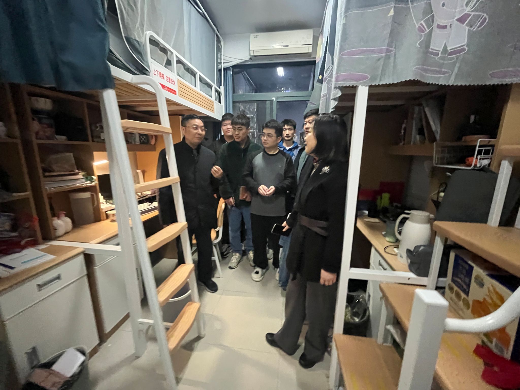 随后,朱军部长走访学生宿舍,与同学们深入交流。同学们围绕学业规划、专业实习等问题畅所欲言。朱军部长耐心倾听,给予暖心回应与细致指导,并鼓励大家保持积极探索的求学精神,在服务国家战略与社会发展的实践中实现青春梦想。