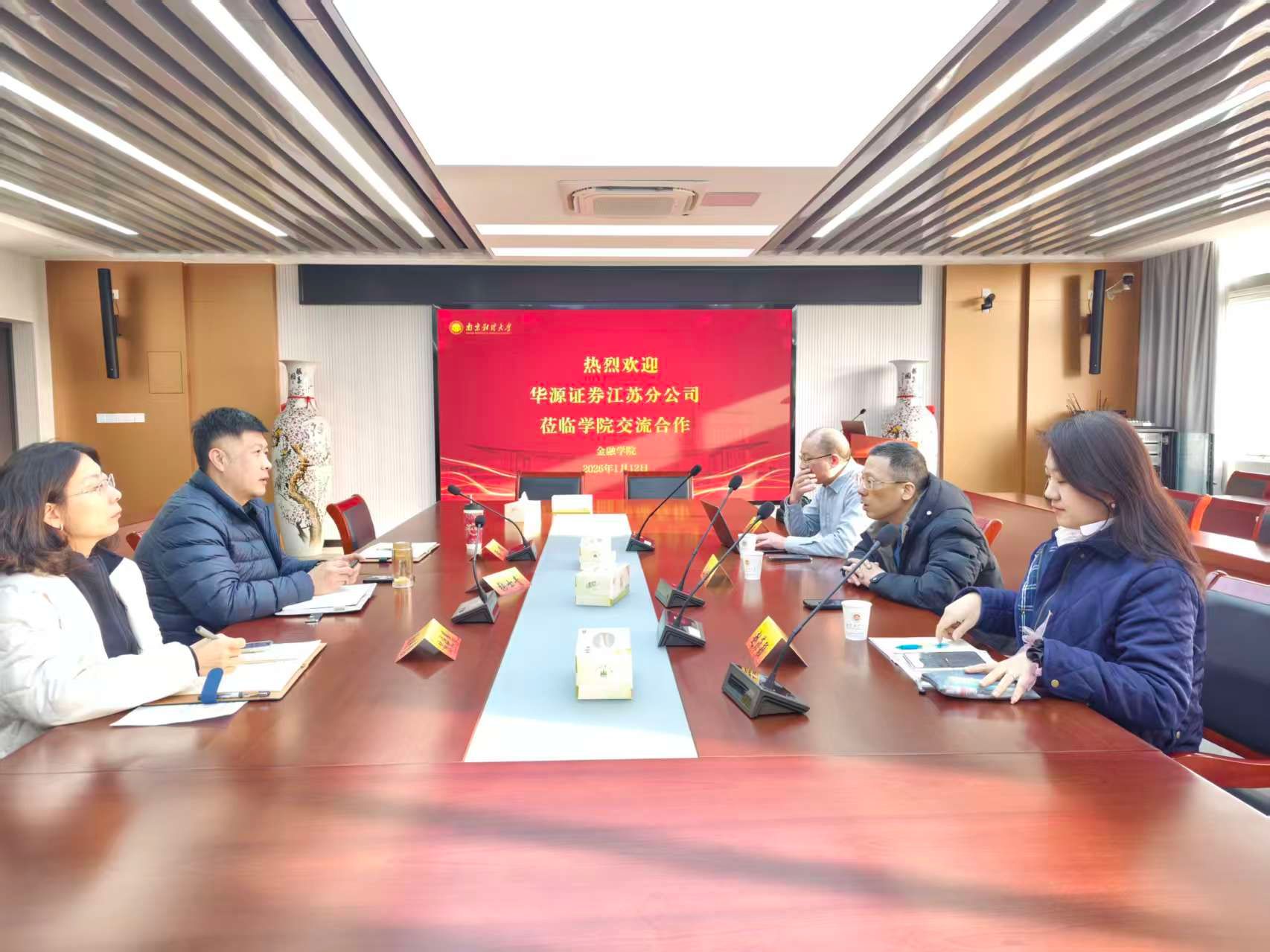 1月12日,华源证券江苏分公司总经理彭洪斌、副总经理赵菲颖、人力资源总监万佳海一行到访大乐透 ,双方就深化校企合作事宜开展座谈交流。大乐透 党委副书记张士青、副院长陈晓慧、学工办主任黄炜出席交流会。