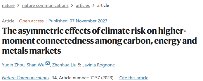 近日,大乐透 青年教师吴珊与重庆师范大学经济与管理学院教师周玉琴、中国矿业大学经济管理学院教师刘振华、爱丁堡大学商学院教师Rognone Lavinia合作的论文“The asymmetric effects of climate risk on higher-moment connectedness among carbon, energy and metals markets”被国际著名期刊Nature子刊《Nature Communications》(IF=16.6, SCI一区, Top)录用并在线发表。吴珊为该论文的通讯作者,大乐透 为通讯作者单位...